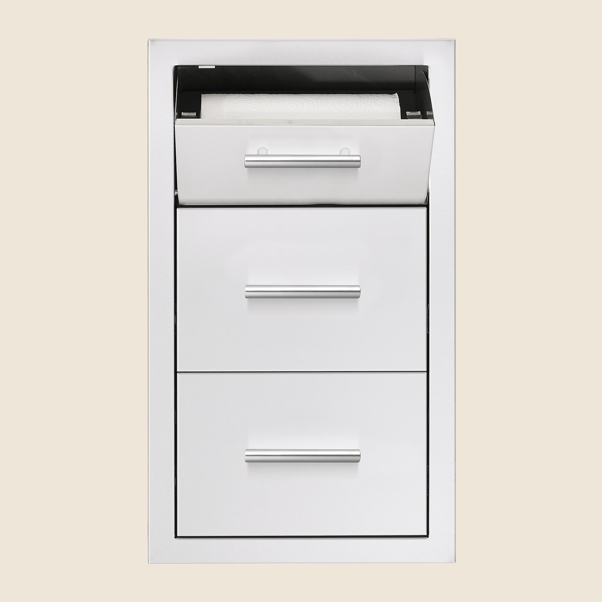 Maximize your outdoor kitchen with Summerset Drawers, designed for efficiency and durability. The 17″ x 30″ Vertical 2-Drawer & Paper Towel Combo features #304 Stainless Steel, a Hingeless Design, Summerset Bar Handles, and Weather-Sealed Construction—all backed by a Gold Standard Lifetime Warranty for lasting performance.